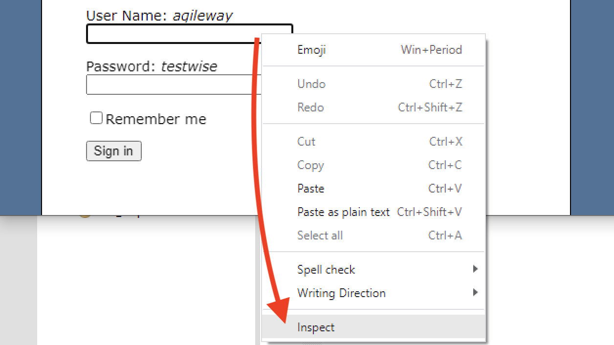 Right-click the user name text box (in the existing Chrome browser), and select “Inspect”.