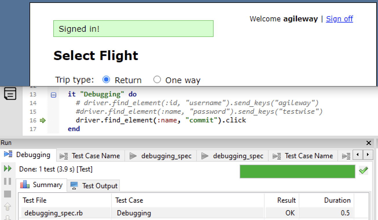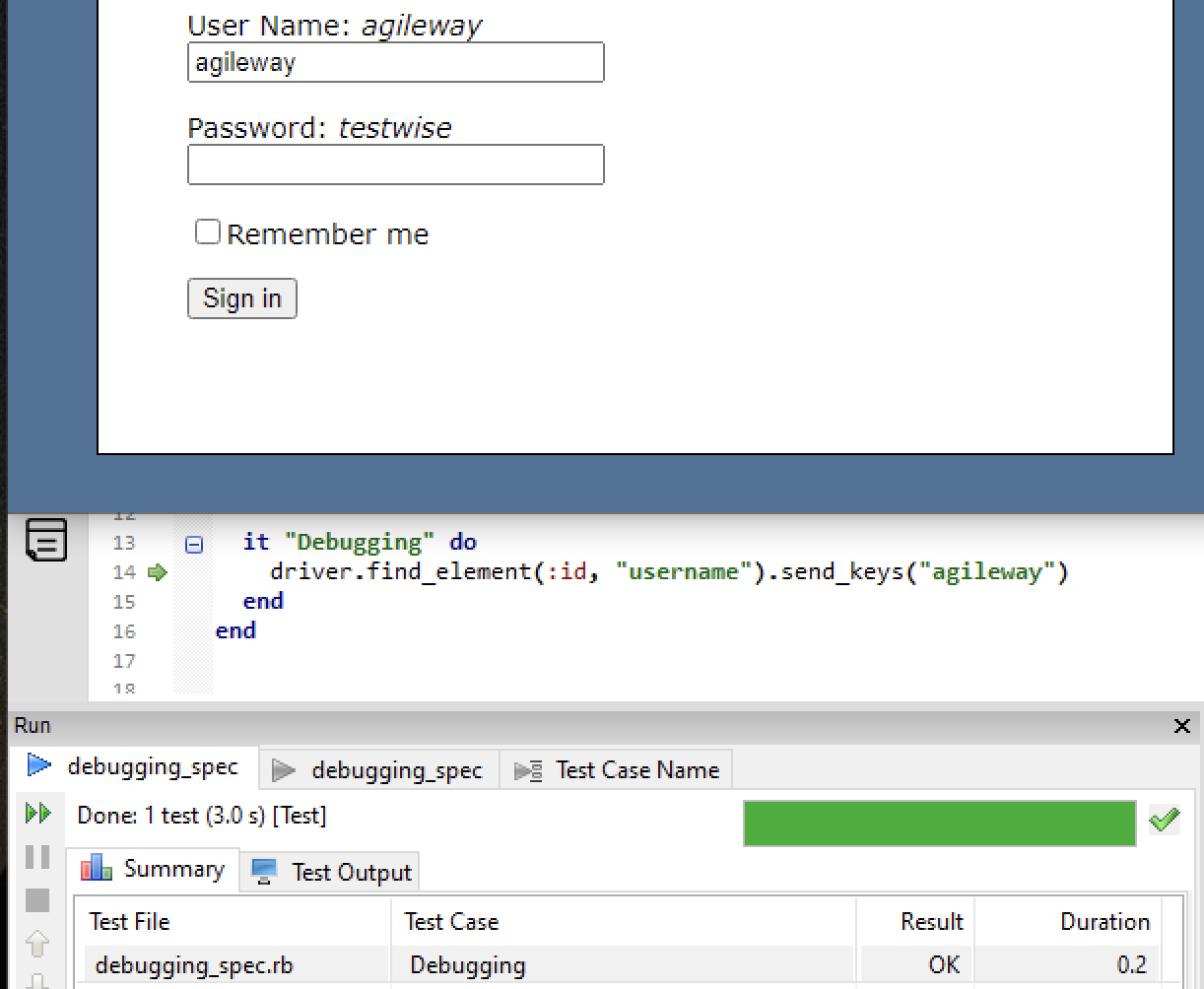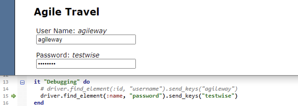 driver.find_element(:name, "password").send_keys("testwise")Run the step in debugging mode.