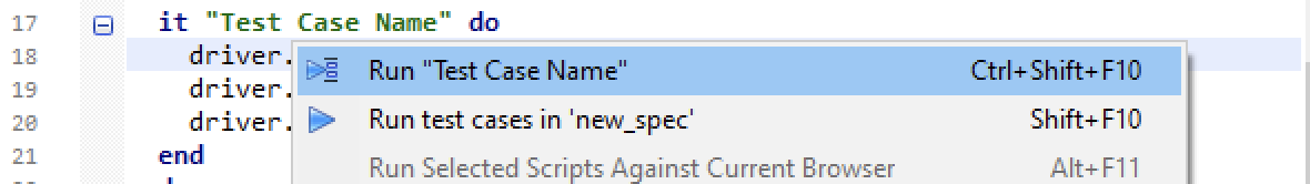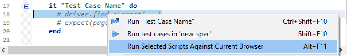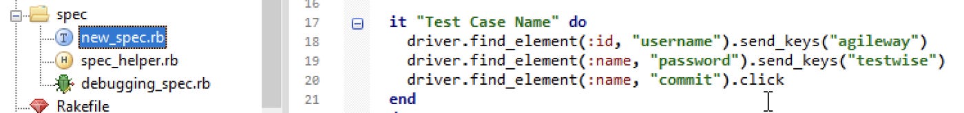 So far we have tried out the test steps in debugging_spec.rb (TestWise debugging mode). Now we know these three test steps are working. Copy them over to the test script file new_spec.rb . Remove all leading # characters (comments).