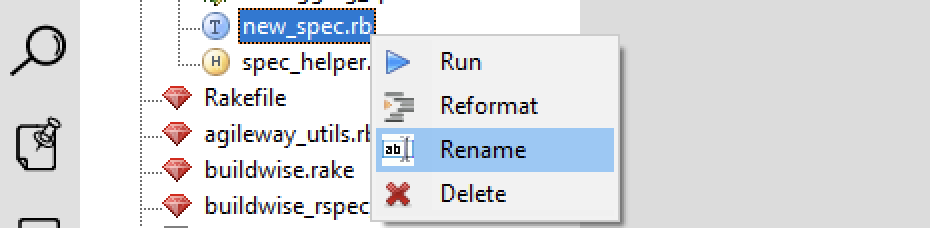 Right-click the file new_spec.rb in the “Project Explorer”, and select “Rename”.