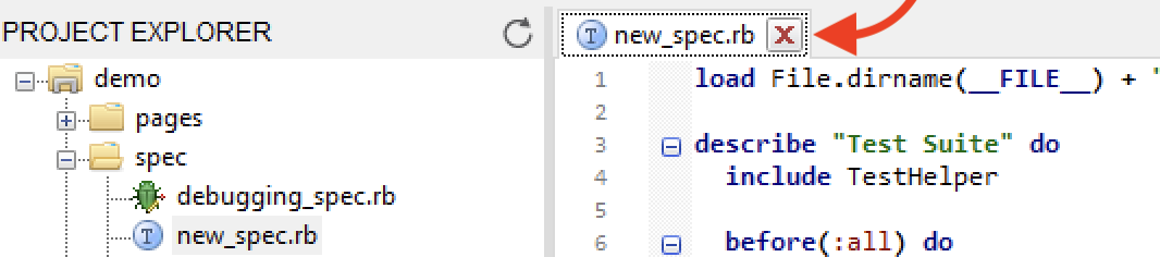 Click theXshape icon next to the file name (as indicated below) to close thenew_spec.rb.