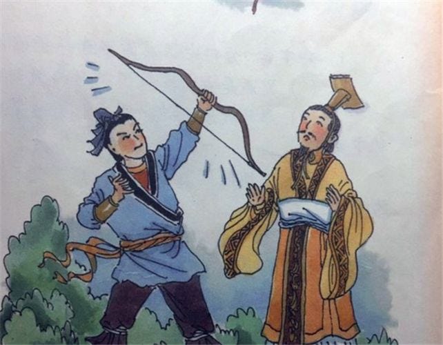 Geng Ying said: “Your Majesty, this is not due to my good skill, but because this is a bird of bad luck. It wailed sadly and shrilly, and flew tiredly. It was already wounded, and for a long time could not find its companion. Therefore it couldn’t stand the least fright. As soon as I twanged my bow, it thought it had been shot and fell down of its own accord from the sky.”